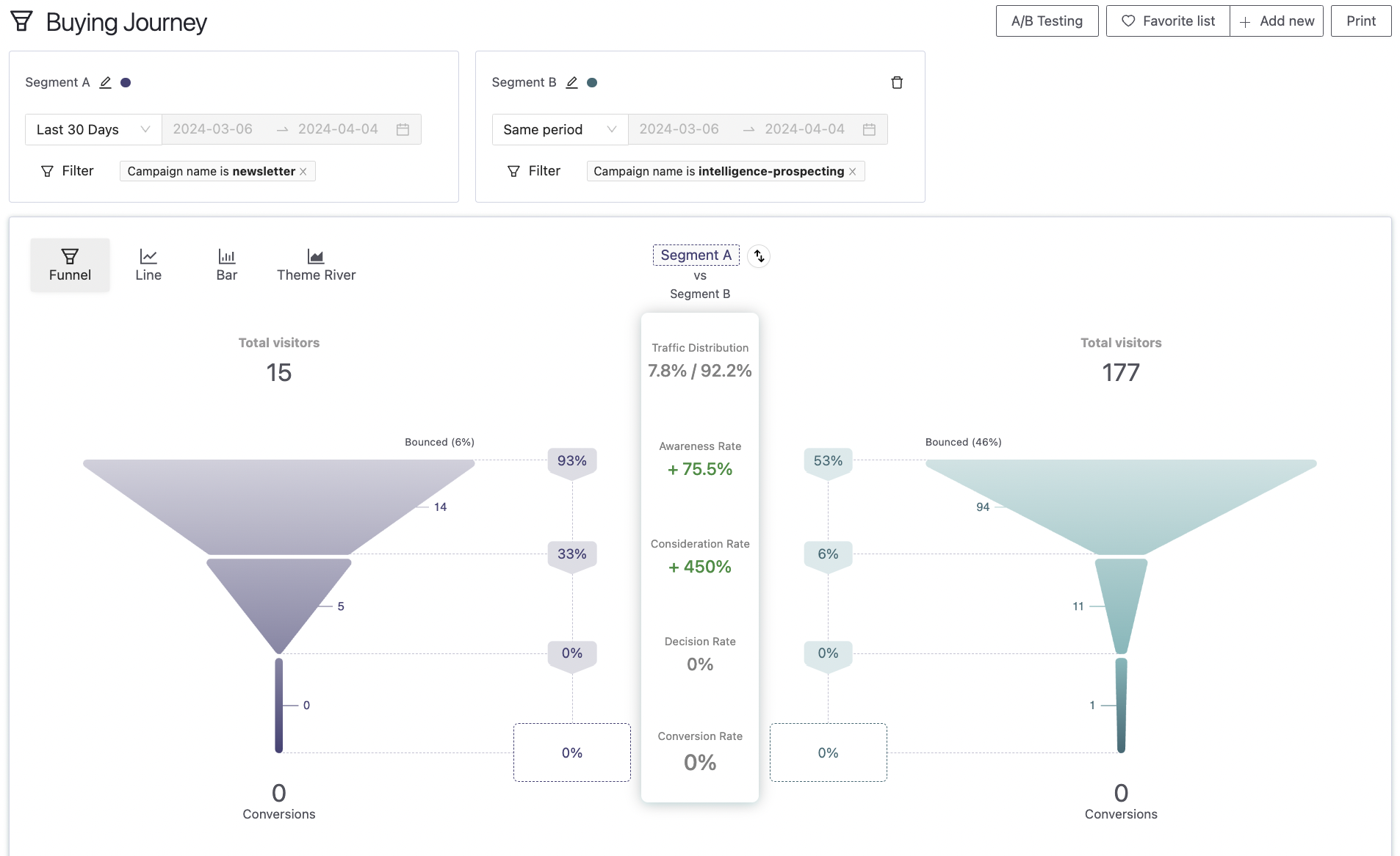 Pathmonk Intelligence will display a comparative analysis of the selected campaigns, showing their performance at each stage of the buyer journey alongside total conversions. This comparison allows marketers to pinpoint which campaigns are most effective and why.