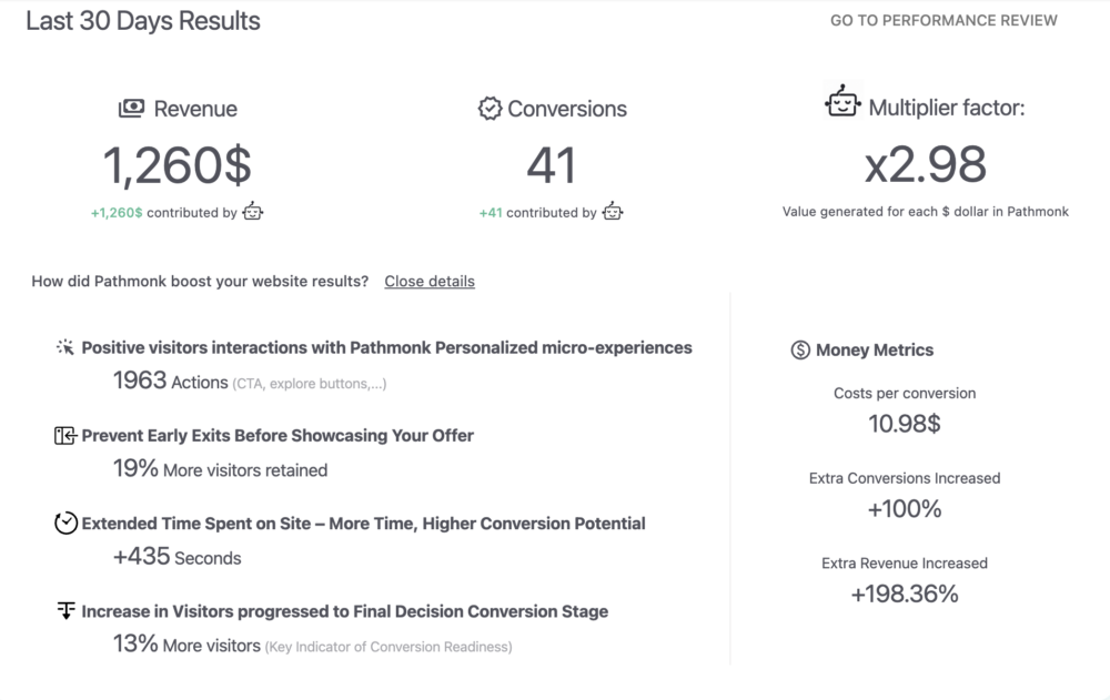 - Revenue impact: Show how Pathmonk drives additional revenue by increasing conversions and improving customer interactions.